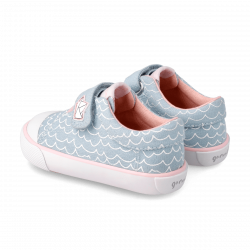 Color celeste con pequeños detalles en rosa claro, olas blancas.