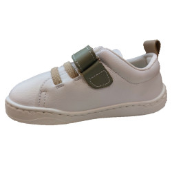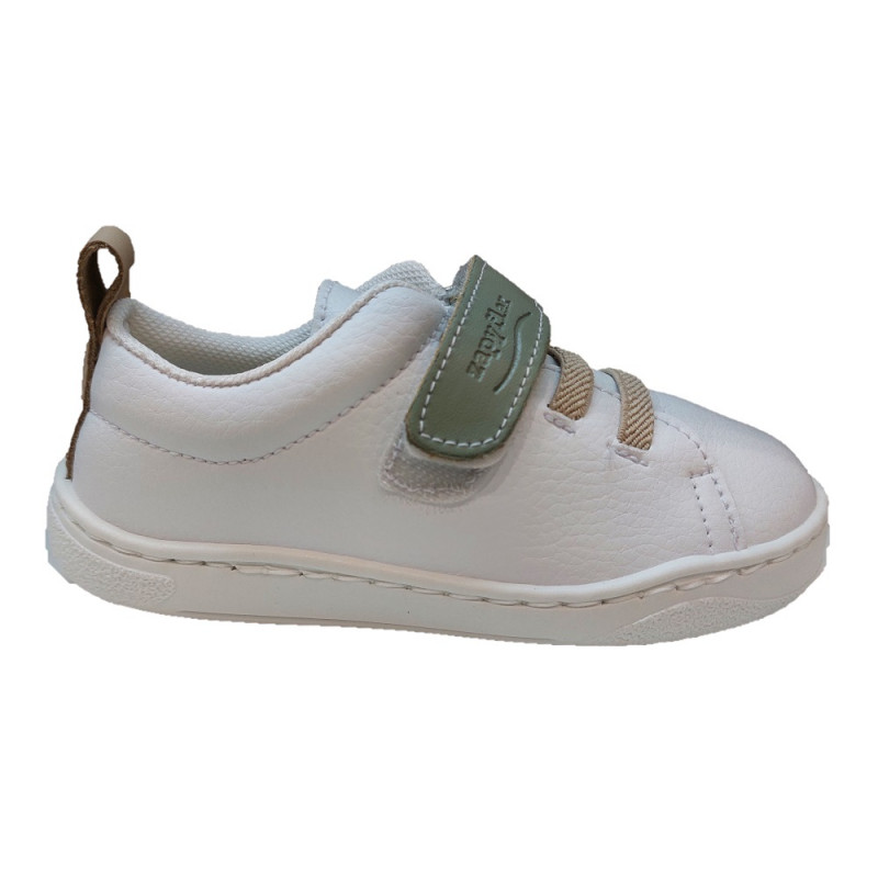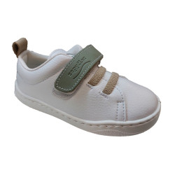 Cierre con 1 velcro verde pastel y elásticos en tono beige como el tirador trasero.